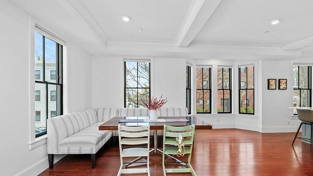 Your dining space glows with natural light streaming through floor-to-ceiling windows that frame charming neighborhood views. The architectural coffered ceiling and gleaming hardwood floors create an elegant backdrop for memorable meals, while the abundant windows dissolve the boundaries between indoor comfort and outdoor beauty.