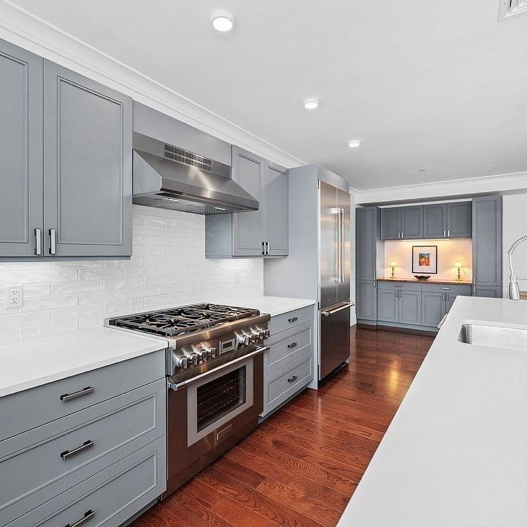 This thoughtfully designed kitchen features Thermador appliances, custom gray cabinetry, and pristine white quartz countertops that stretch across an oversized island. Three pendant lights illuminate the space beneath coffered ceilings, while black-framed windows create an open, airy atmosphere that flows seamlessly into your living areas.